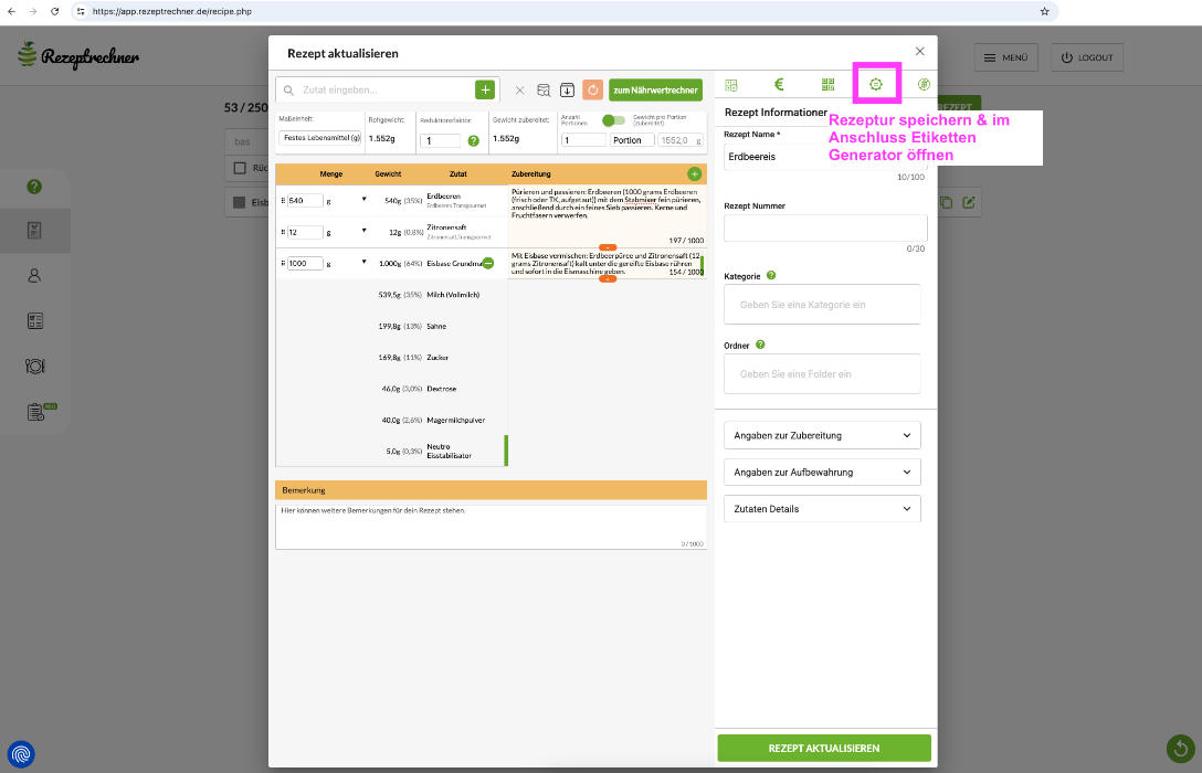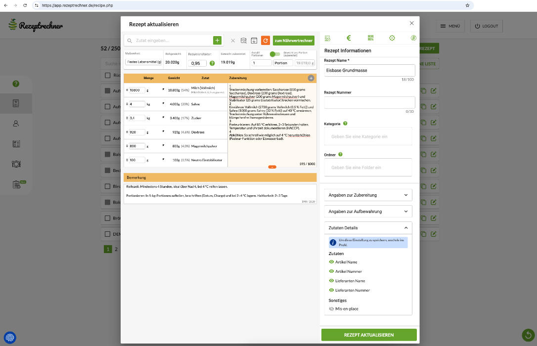 Du kannst zusätzlich im Bemerkungsfeld deine Zubereitungsanweisungen, Pasteurisierungstemperaturen und HACCP-Hinweise hinterlegen. Das hilft dir und deinem Team später bei der Reproduktion.
