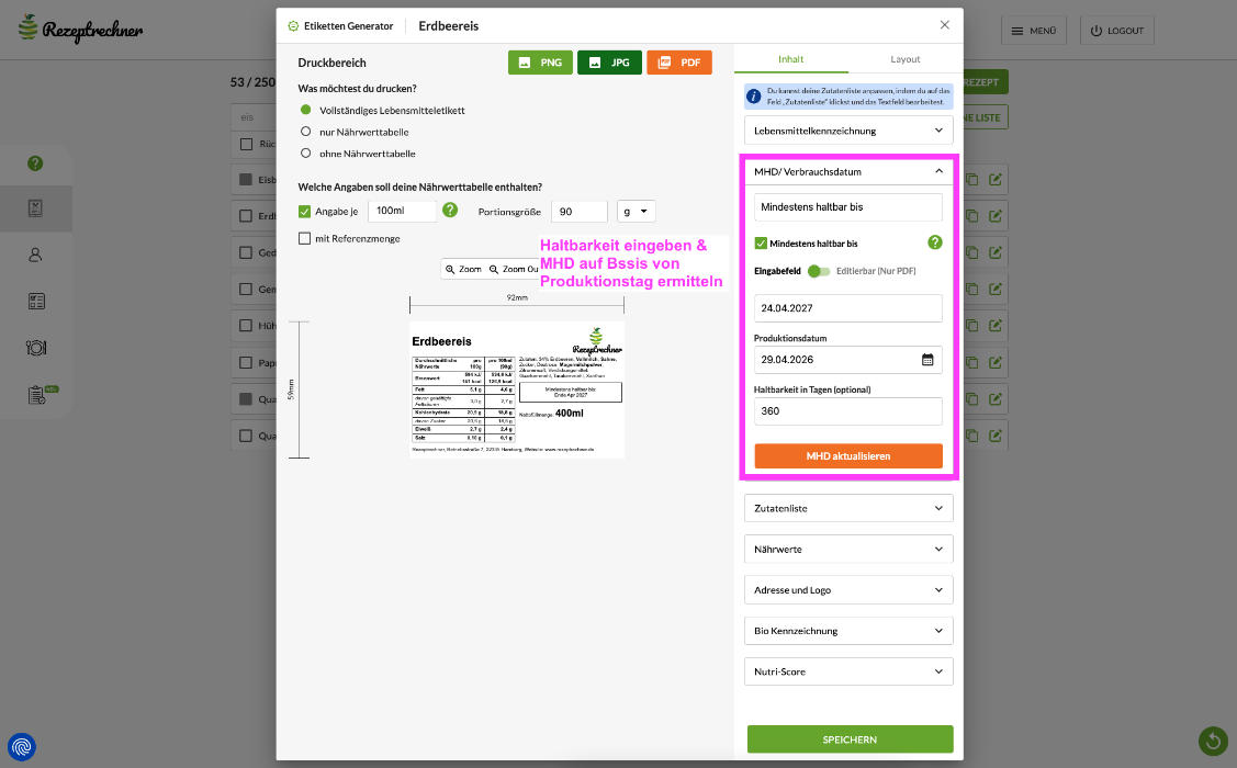Das Mindesthaltbarkeitsdatum ist eine LMIV-Pflichtangabe. Bei tiefgekühltem Speiseeis sind 6 bis 12 Monate üblich – abhängig von Rezeptur, Verpackung und konstanter Tiefkühltemperatur (−18 °C). Im Etiketten-Generator unter MHD/Verbrauchsdatum trägst du entweder direkt das Datum ein („Mindestens haltbar bis: 24.04.2027") oder du nutzt die Hilfsfunktion: gib das Produktionsdatum ein (z. B. 29.04.2026) und die Haltbarkeit in Tagen (z. B. 360) – der Rezeptrechner errechnet das MHD daraus.