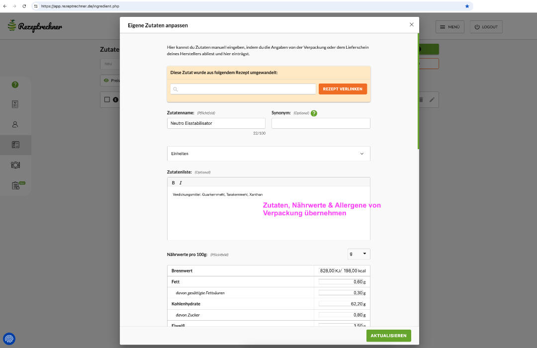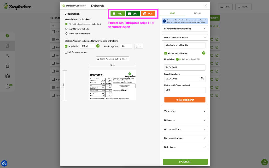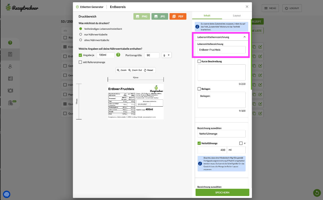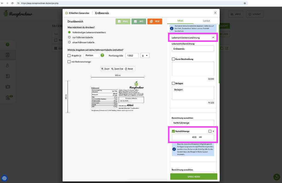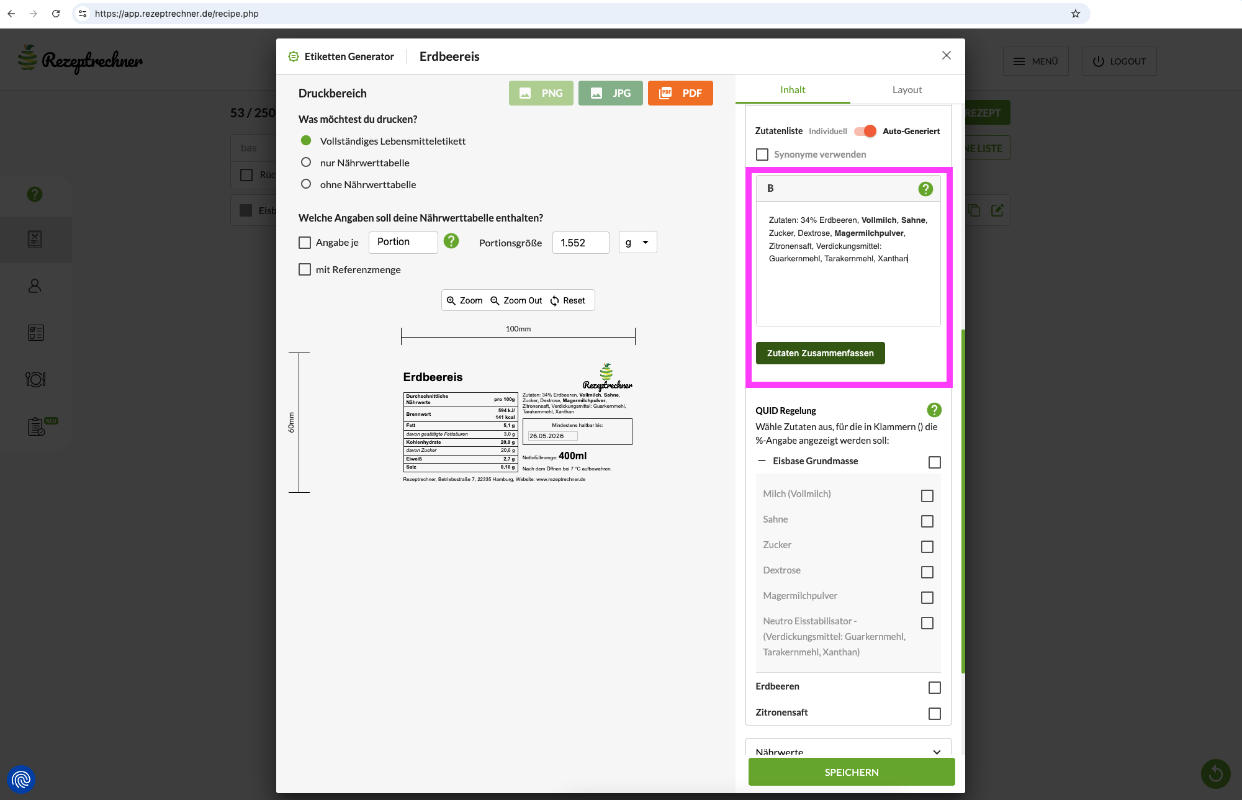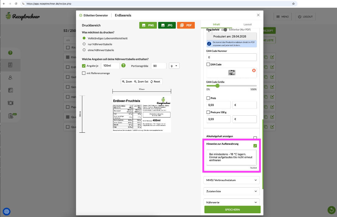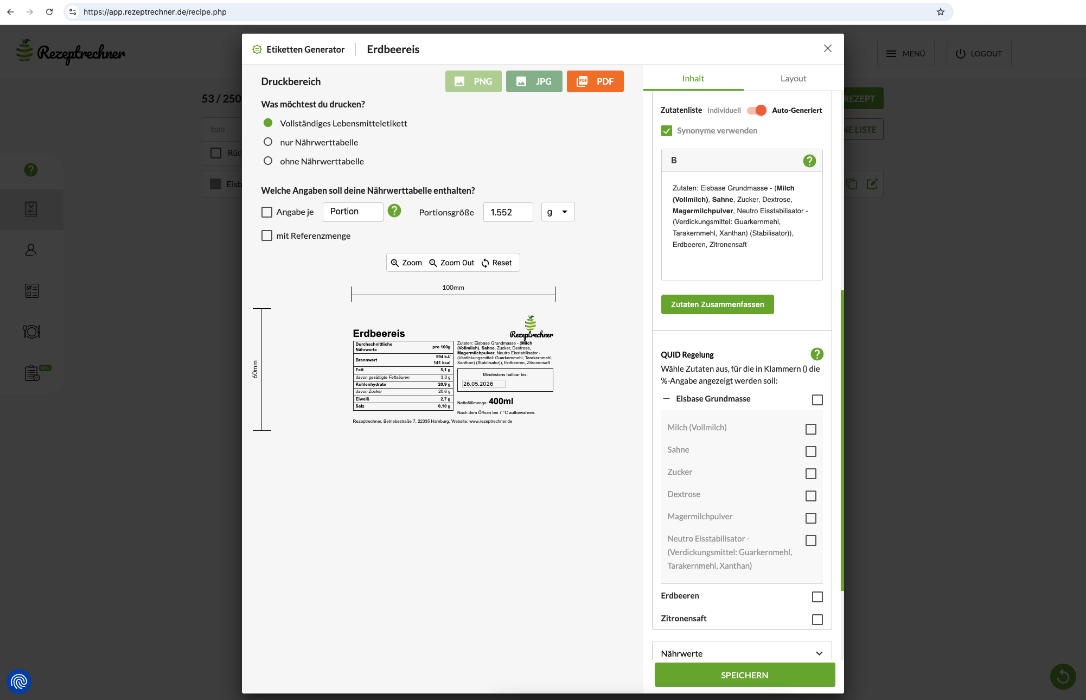 Wie weiter oben erwähnt: ändert sich die Rezeptur, werden manuelle Anpassungen an der Zutatenliste zurückgesetzt. Speichere das Etikett also erst, wenn die Rezeptur tatsächlich final ist – ansonsten doppelte Arbeit.