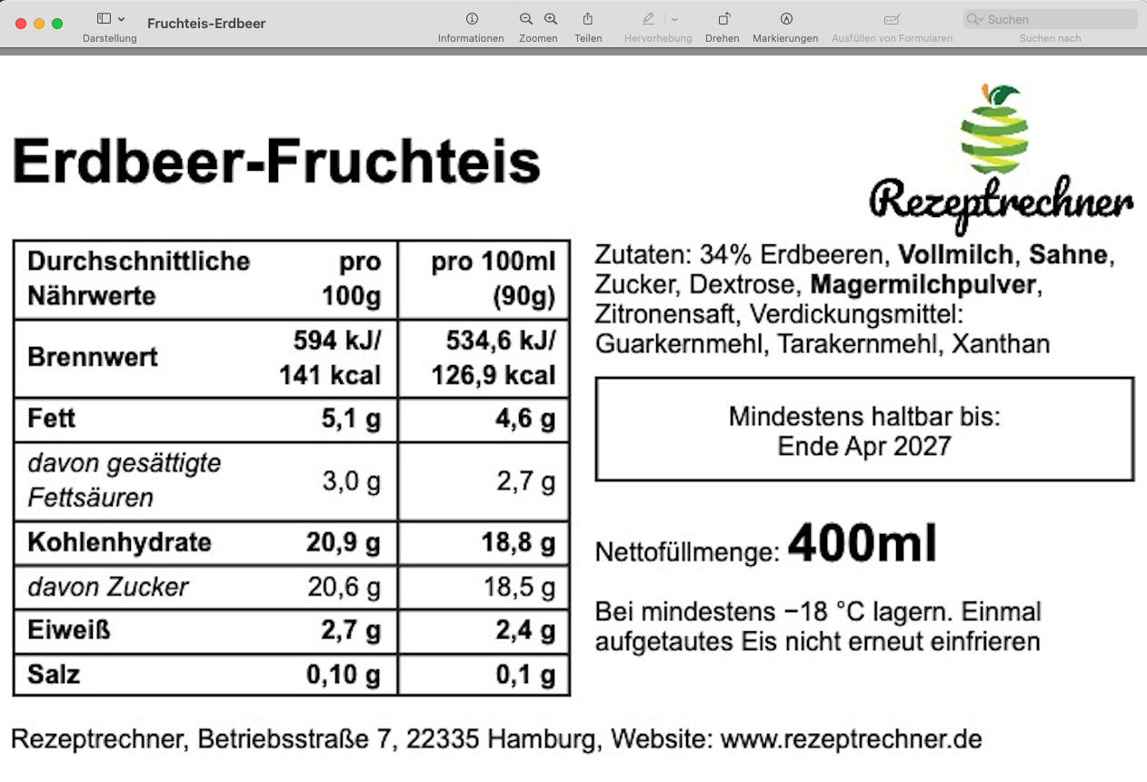 Unser Beispielrezept enthält 34 % Erdbeeren und erfüllt damit die Fruchteis-Anforderung. Die saubere Verkehrsbezeichnung ist „Erdbeer-Fruchteis" – beides drin: Geschmack und Sorten-Kategorie. Diesen Wert trägst du im Feld Lebensmittelbezeichnung ein.