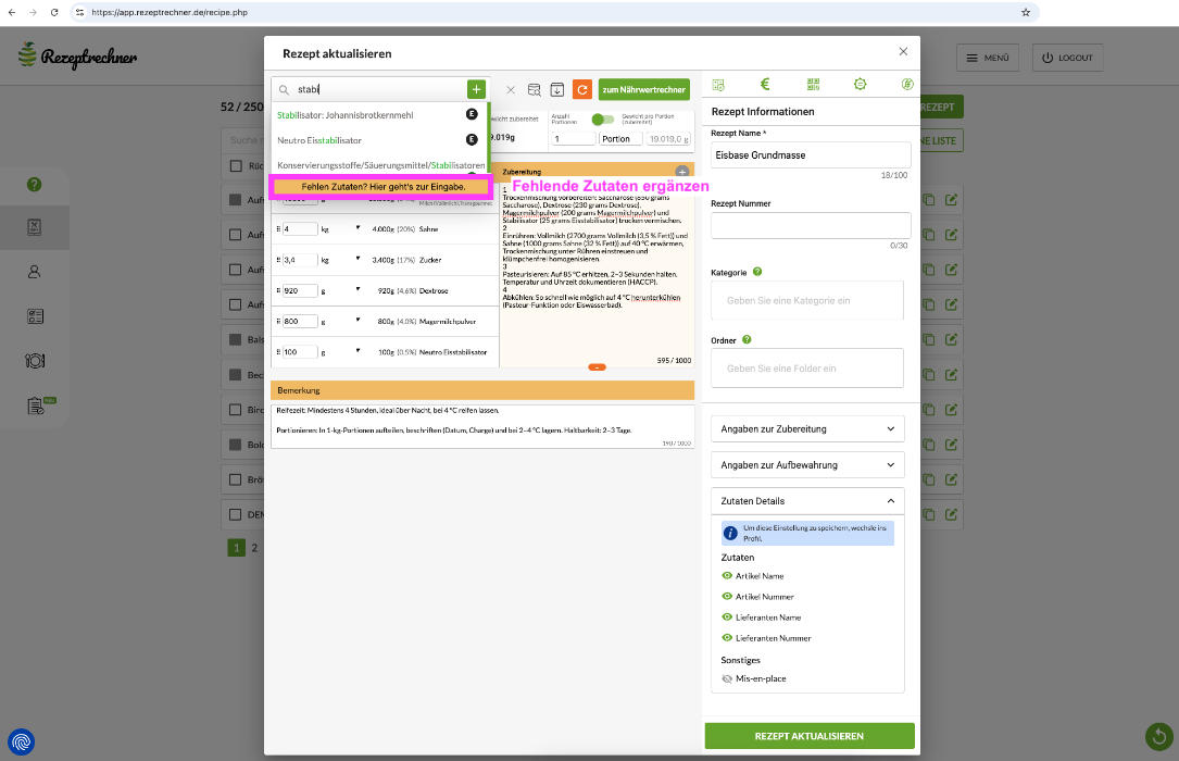 - 1. Eisbase als Rezept angelegt und in eine wiederverwendbare Zutat umgewandelt