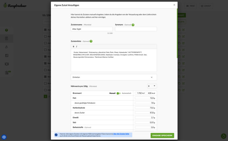 Eigene zusammengesetzte Zutat ohne Rezept-Verknüpfung – wie After Eight. Sub-Zutaten, Allergene und Nährwerte sind statisch hinterlegt; Änderungen erfolgen nur, wenn du die Zutat selbst bearbeitest.