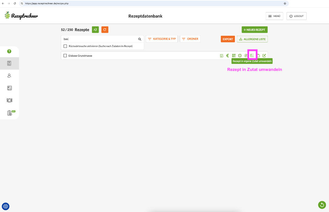 Jetzt kommt der Schritt, der dir später am meisten Zeit spart: Du wandelst deine fertige Eisbase-Rezeptur in eine wiederverwendbare Zutat um. Geh in der Rezeptdatenbank auf deine Eisbase, klicke auf das Icon „Rezept in eigene Zutat umwandeln" – fertig. Ab jetzt taucht die Eisbase Grundmasse in der Zutaten-Suche auf, genau wie eine einzelne Zutat.