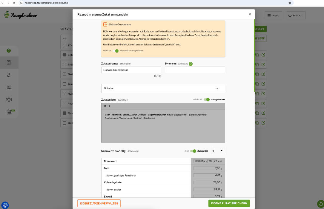 Es öffnet sich das Eingabeformular für die neue Zutat – mit vorausgefüllter Sub-Zutatenliste, Nährwerten und Allergenen aus deinem Rezept. Achte hier auf den Schalter im orangen Hinweisfeld oben: Er sollte auf „dynamisch (empfohlen)" stehen. Damit ziehen alle Eissorten, die diese Eisbase nutzen, später automatisch nach, wenn du die Grundmasse anpasst (z. B. neuer Milchlieferant, andere Stabilisator-Mischung). Steht der Schalter auf „statisch", bleiben die Werte eingefroren – das ist nur sinnvoll, wenn die Komponente bewusst nicht mit dem Rezept mitwachsen soll.