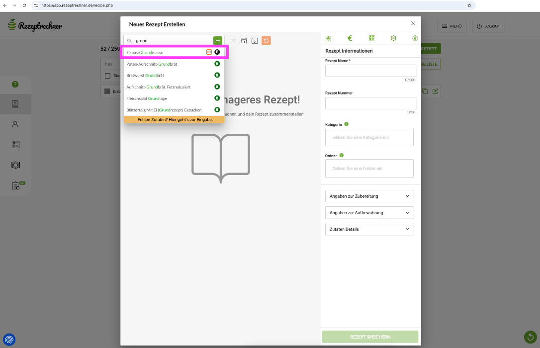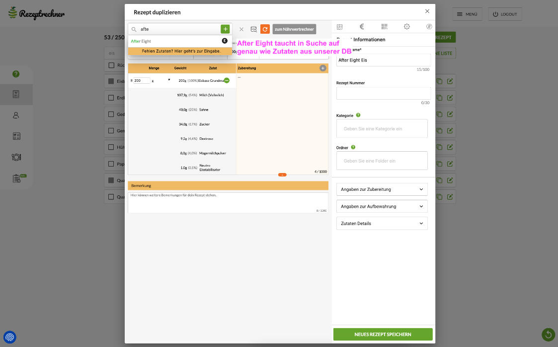 Jetzt geht es ans Eisrezept. Lege ein neues Rezept an und such im Zutatenfeld nach deinen eigenen Zutaten – egal ob „grund" für die Eisbase Grundmasse oder „afte" für die After Eight. Beide tauchen in der Suche auf, tragen aber unterschiedliche Symbole: