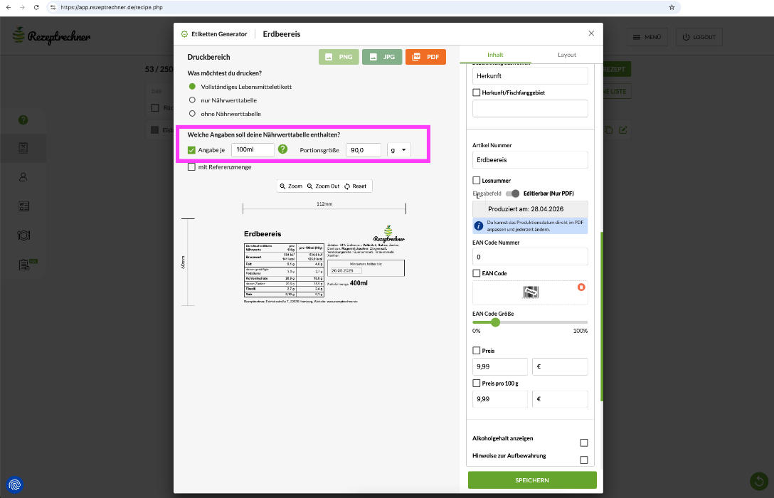 So stellst du 100 ml im Etiketten-Generator ein: Auf der linken Seite des Druckbereichs aktivierst du das Häkchen „Angabe je" und wählst 100 ml. Im Feld Portionsgröße trägst du das Gewicht von 100 ml deines Eises in Gramm ein – im Beispiel sind das 90 g, das entspricht einer Dichte von 0,9 g/ml. Der Rezeptrechner rechnet die Werte aus der Nährwertberechnung pro 100 g entsprechend um. Die Dichte ermittelst du am einfachsten selbst, indem du einmal 100 ml deines fertigen Eises abwiegst.