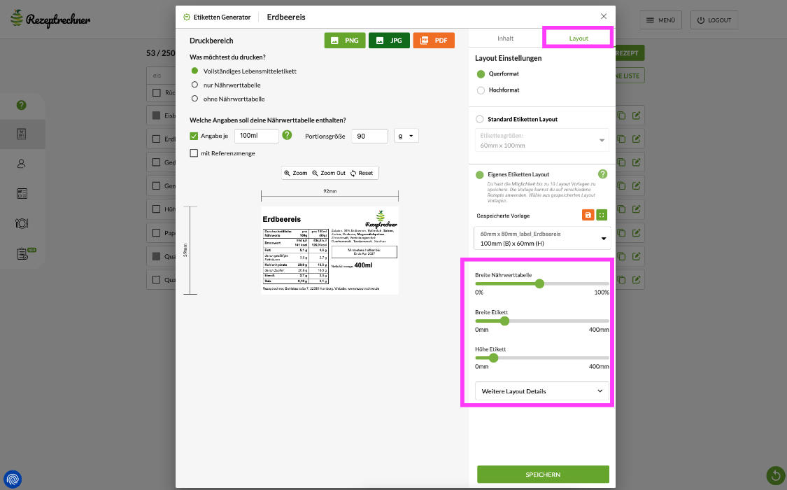 Die Slider Breite Nährwerttabelle, Breite Etikett und Höhe Etikett erlauben dir die feine Anpassung an dein gekauftes Etikettenpapier.