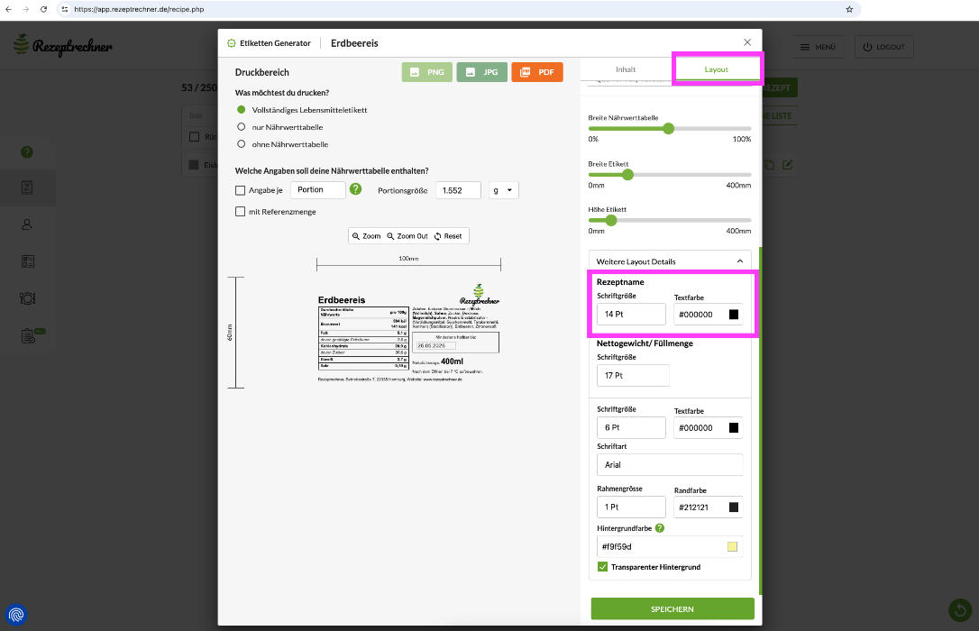 Unter „Weitere Layout Details" legst du Schriftgrößen, Schriftart, Rahmenstärke und Hintergrundfarbe für jedes einzelne Element fest. In meinem Beispiel sind Rezeptname auf 14 Pt und Nettofüllmenge auf 17 Pt gestellt – beide gut lesbar, ohne dass das Etikett überladen wirkt. Die Schriftart Arial ist für Pflichtangaben auf Lebensmitteletiketten ein sicherer Standard.