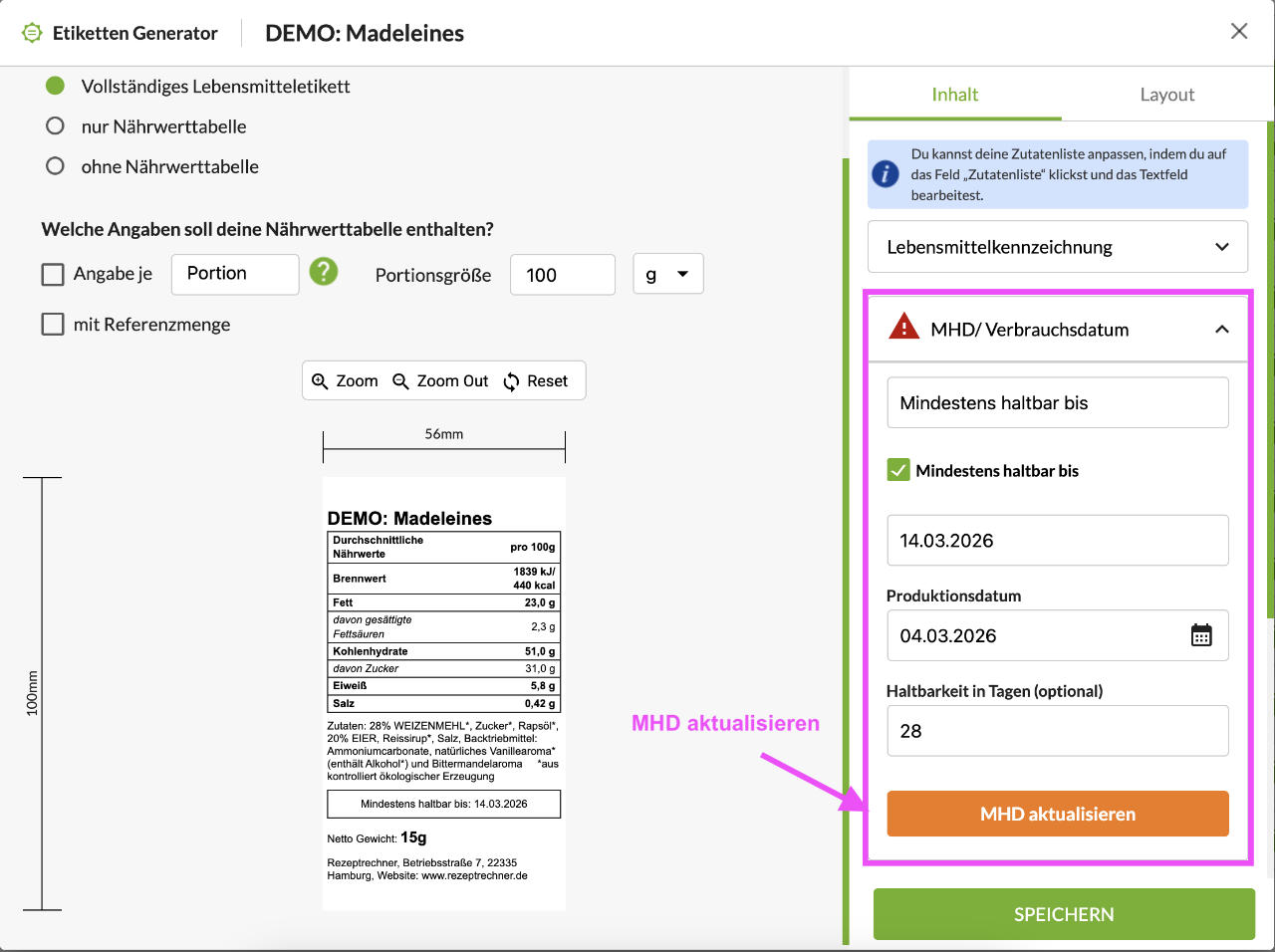Um für deine gespeicherten Rezepte vollständige Lebensmitteletiketten zu erstellen, öffne den Etiketten Generator (siehe Bild unten) in der neuen Rezeptdatenbank.