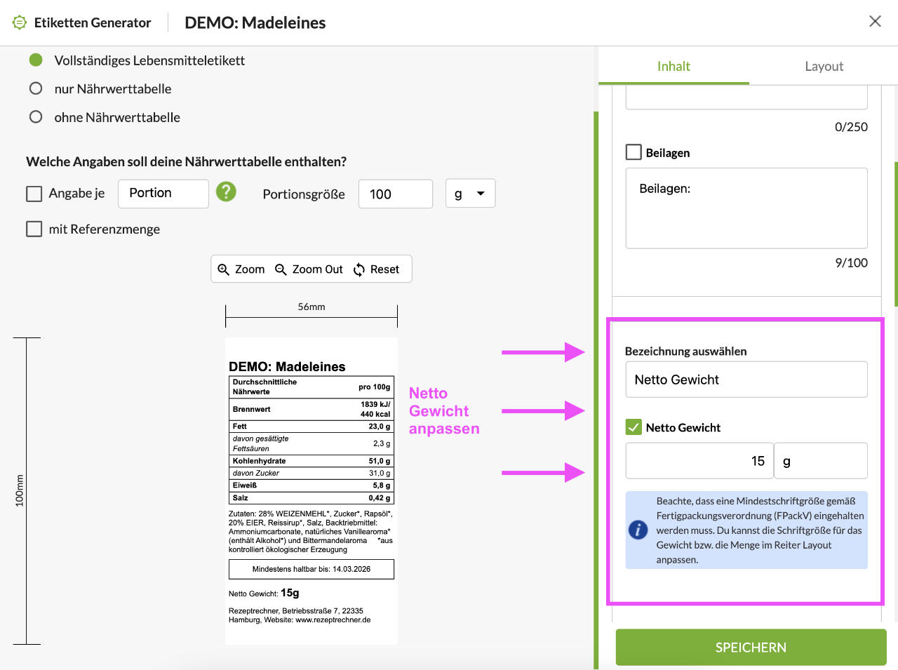Der erste Reiter „Inhalt“ ist nur relevant, wenn du vollständige Lebensmitteletiketten erstellen möchtest. Hier kannst du noch weitere Pflichtangaben für die Etiketten ergänzen wie z.B. Aufbewahrungshinweise, MHD, Nettofüllgewicht (oder Füllmenge).