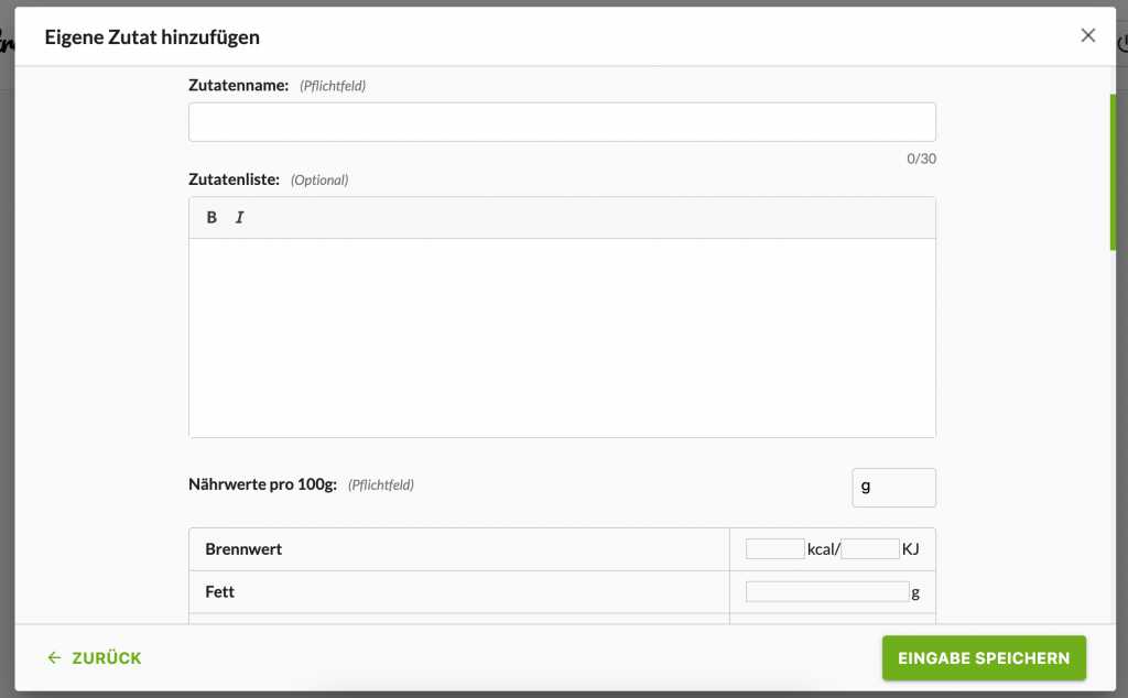 2. Lösungsansatz: Eigene Zutaten mit eigenen Nährwertangaben (neue Eingabemaske)