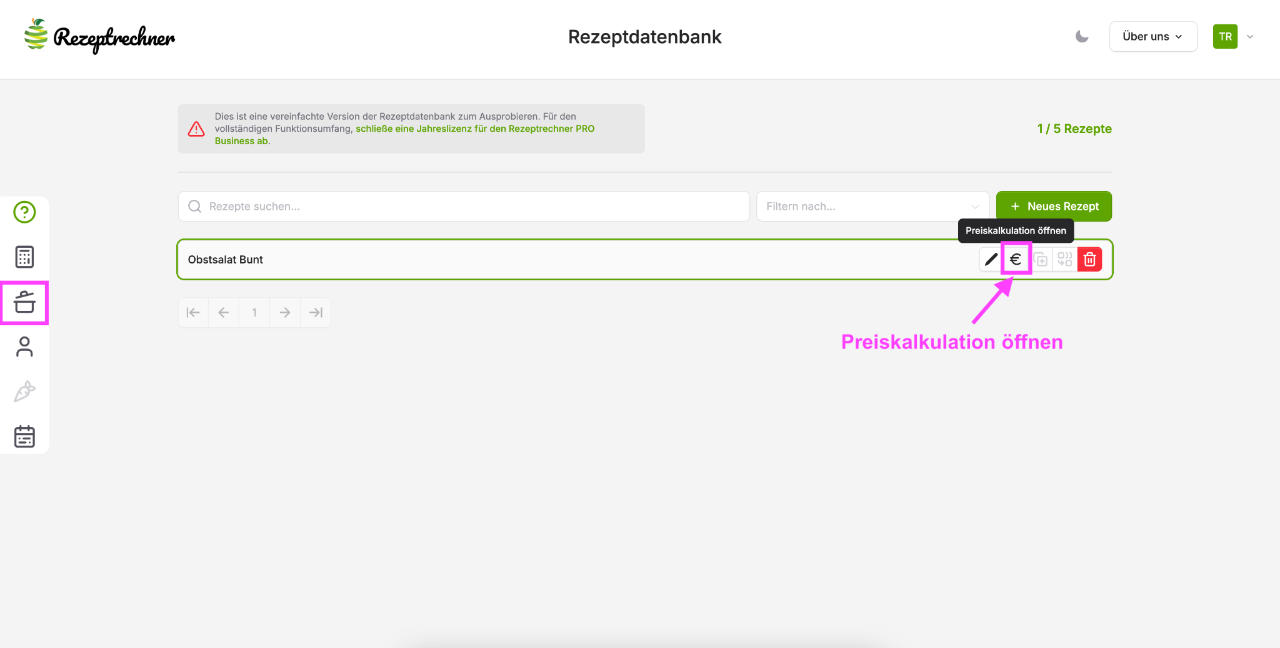 Zur Preiskalkulation gelangst du, indem du in der Rezeptdatenbank das € Symbol klickst.