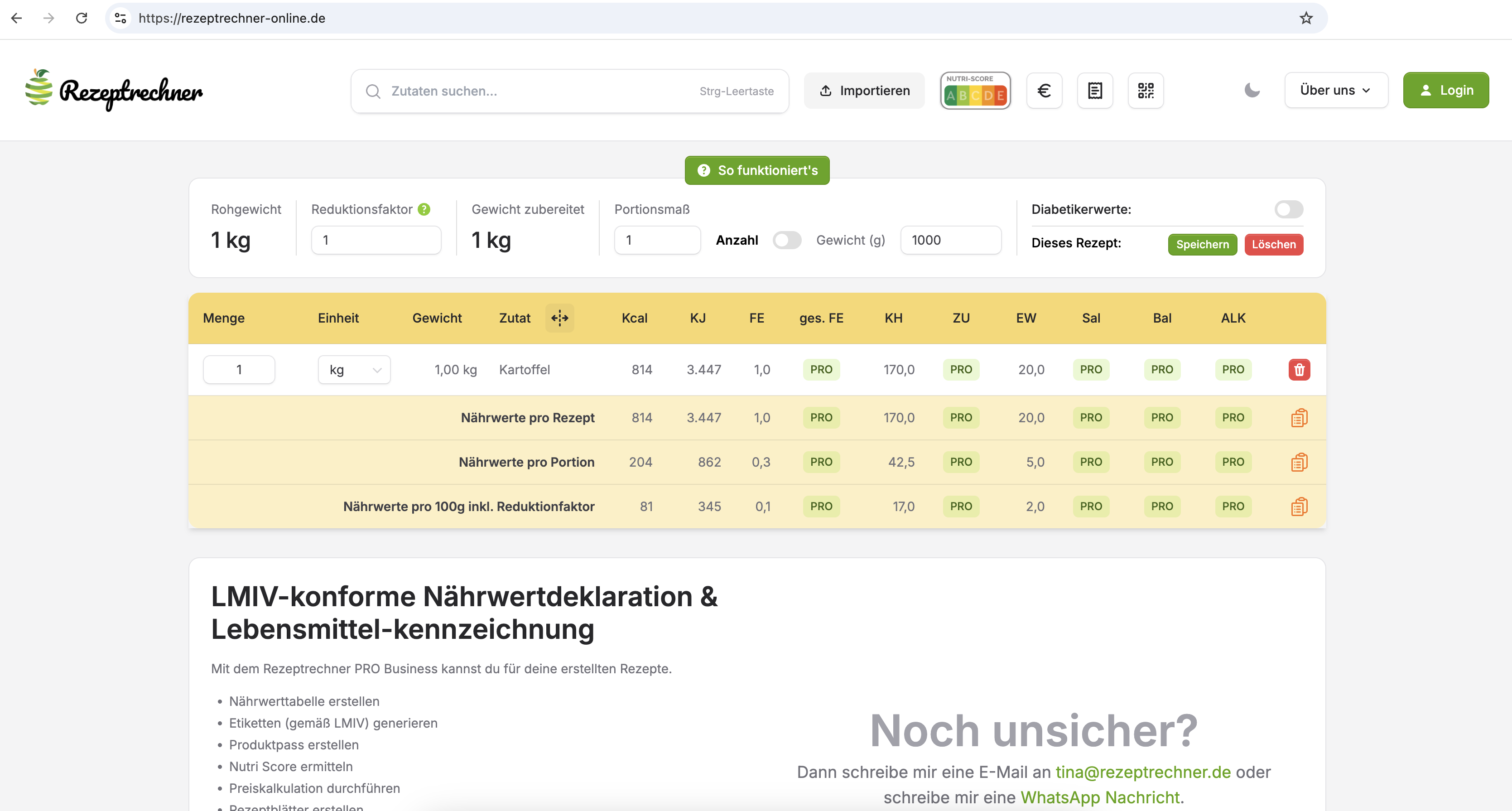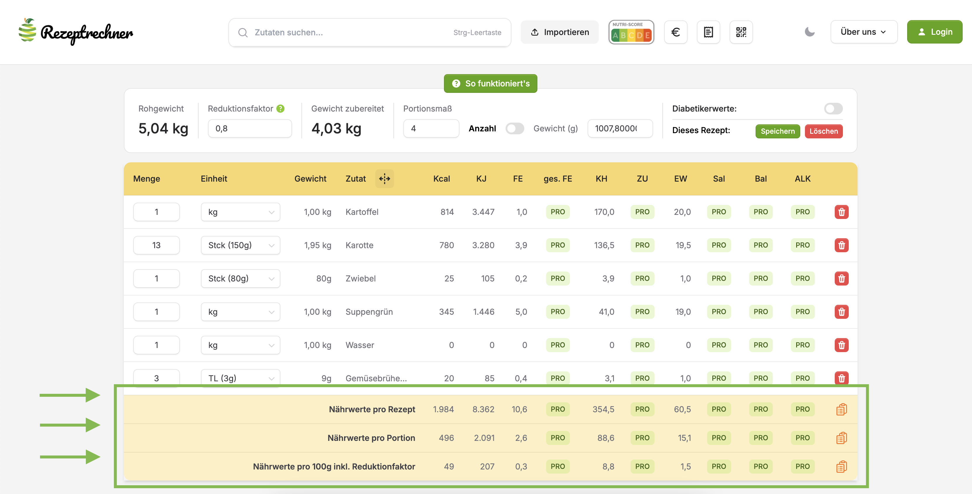 Beachte, dass du gemäß LMIV die Nährwerte so angeben musst, wie dein Lebensmittel/ Produkt abgegeben wird. Wenn du zum Beispiel eine Kartoffelsuppe herstellst, gibst du die Rohzutaten ein und kochst das Ganze noch ein. Der Kochverlust oder Backverlust kann über den Reduktionsfaktor im oberen Bereich berücksichtigt werden.