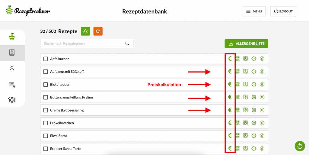 Öffne die Preiskalkulation für eines deiner Rezepte indem du auf das €-Symbol klickst.