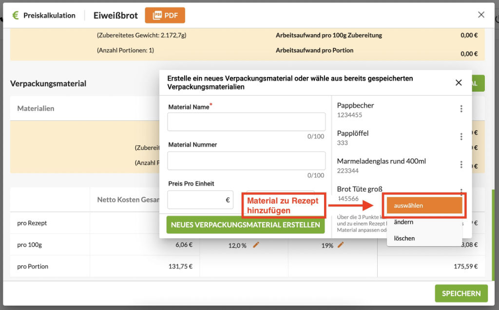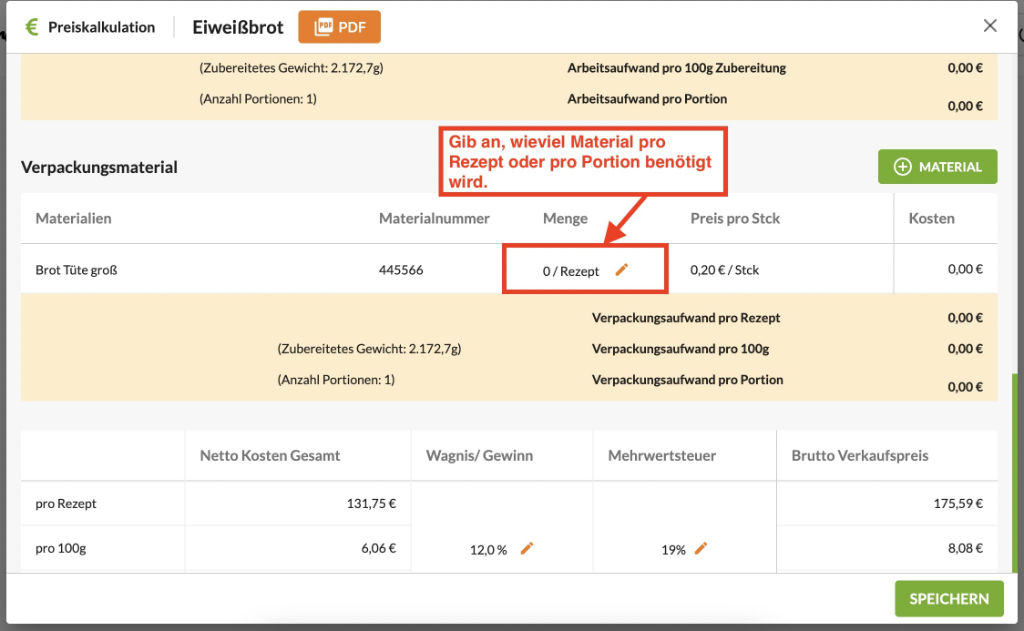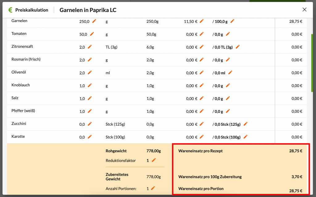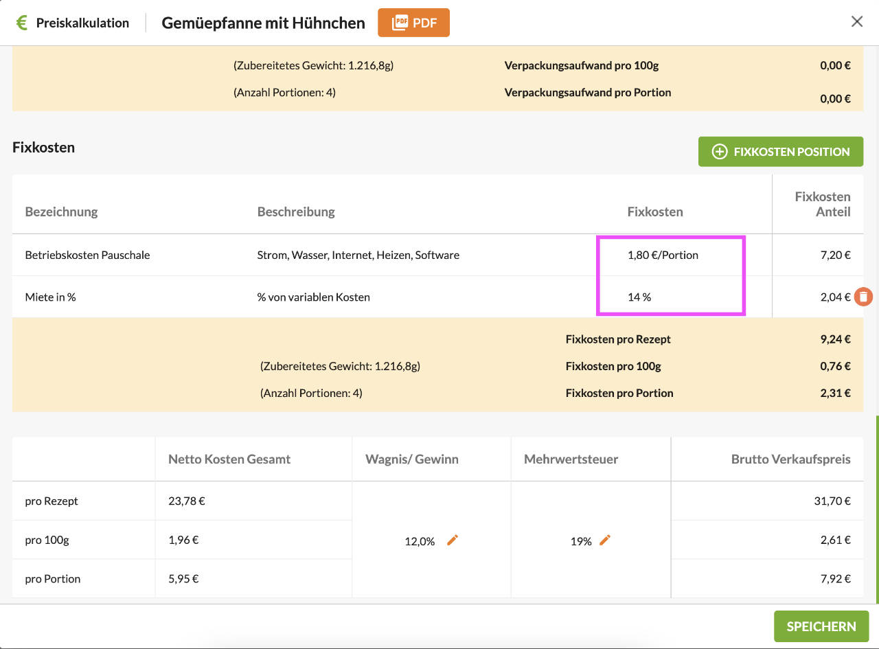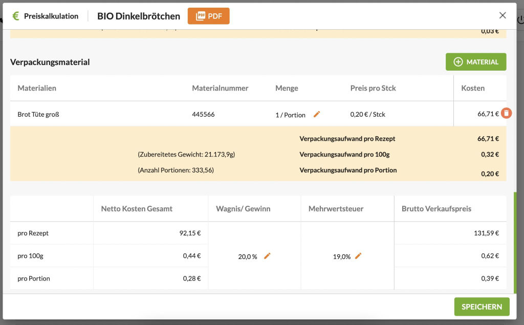 Letztlich kannst du auch unter Berücksichtigung von Mehrwertsteuer und Marge einen finalen Verkaufspreis pro 100g oder pro Portion berechnen.