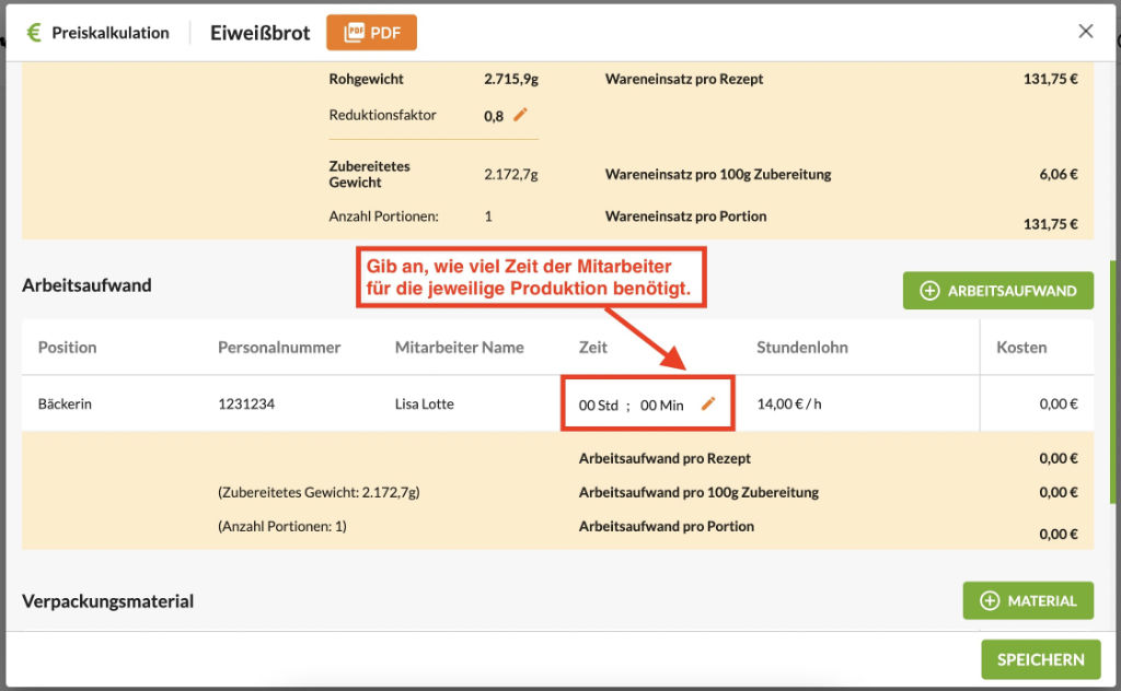 Wenn du noch unsicher bist, wie hoch der Arbeitsaufwand pro Rezeptur ist, kannst du den Personalaufwand hier auch als prozentualen Aufschlag berücksichtigen.