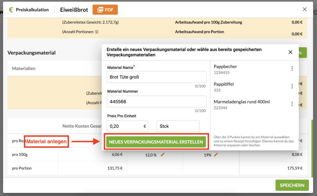 Um ein Verpackungsmaterial hinzuzufügen, lege das Material zunächst mit den Stückkosten an.