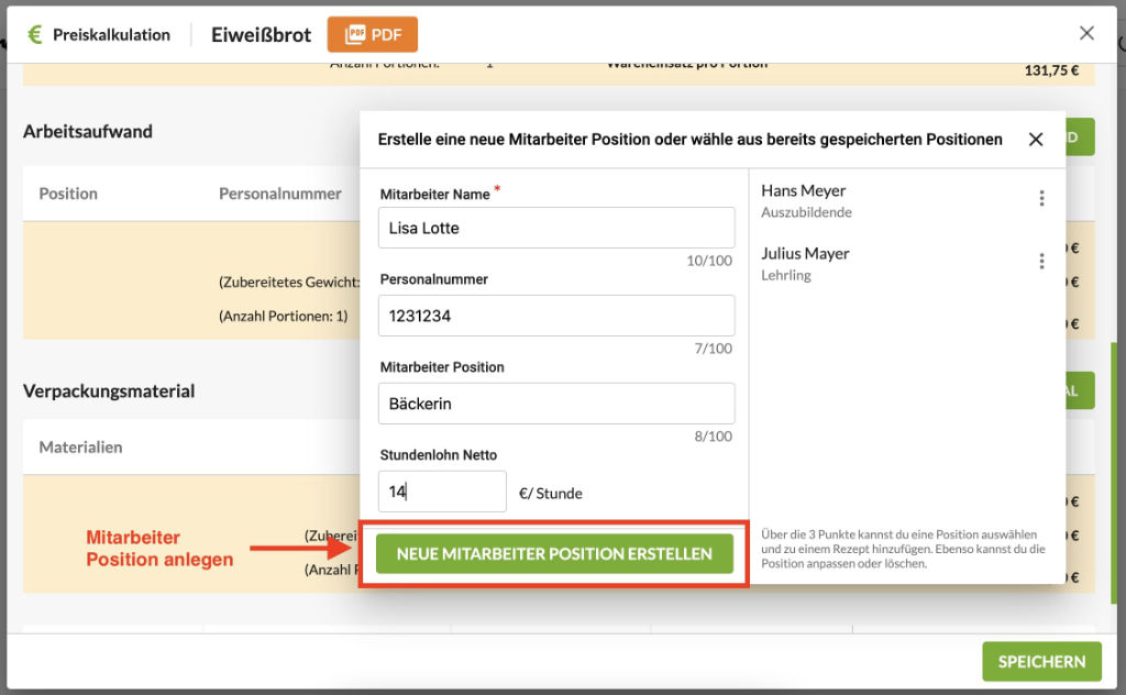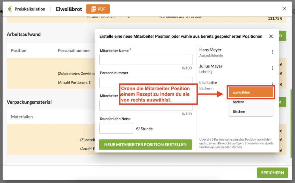 Im Anschluss taucht der Mitarbeiter auf der rechten Seite auf. Von hier aus kannst diesen Mitarbeiter verschiedenen Rezepten zuordnen, indem du die Position auswählst.