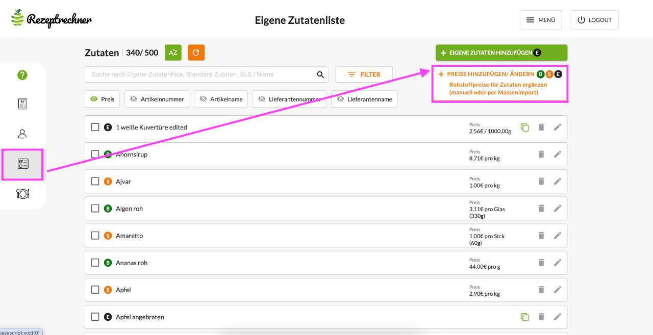 Die Verwaltung der Rohstoffpreise erfolgt entweder direkt über die Preiskalkulation vom jeweiligen Rezept oder zentral in deiner eigenen Zutatenliste.