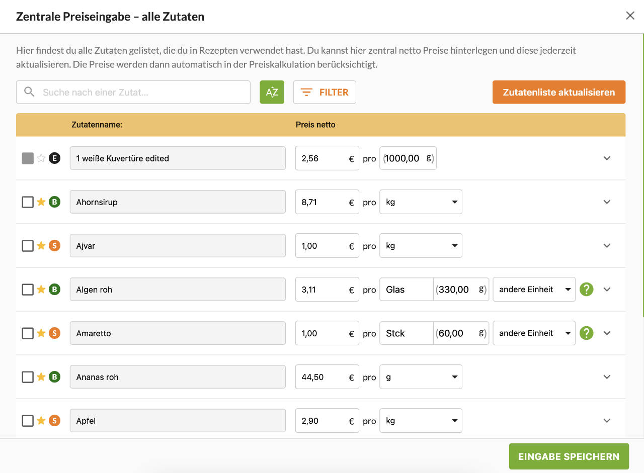 Gib manuell Preise ein und speichere deine Eingabe (geeignet für schnelle Anpassungen von wenigen Zutaten).