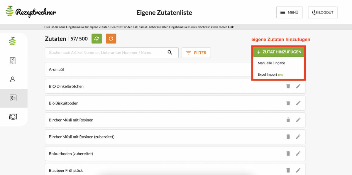 Hast du nur wenige eigene Zutaten, dann nutze die manuelle Eingabemaske.