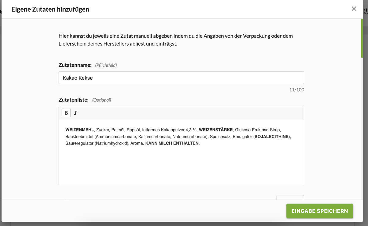 Noch ein Tipp: Sofern die sub-Zutatenliste deiner Zutat bekannt ist, gib diese ebenfalls an. Die sub-Zutatenliste wird dann beispielsweise im Etiketten Generator in Klammern hinter deiner Zutat angezeigt, so wie das gemäß LMIV vorgesehen ist.