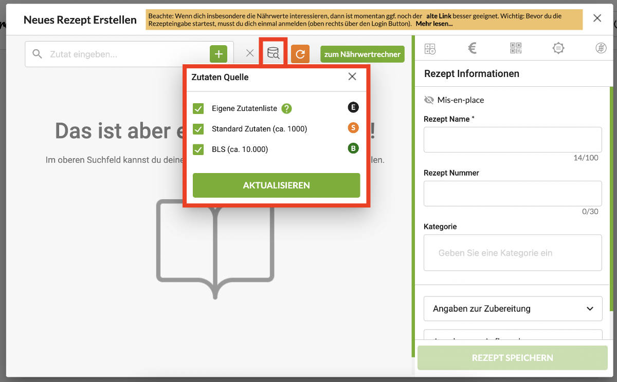 Über das Datenbank Symbol rechts neben dem Suchfeld kannst du die verschiedenen Quellen der Zutaten filtern: