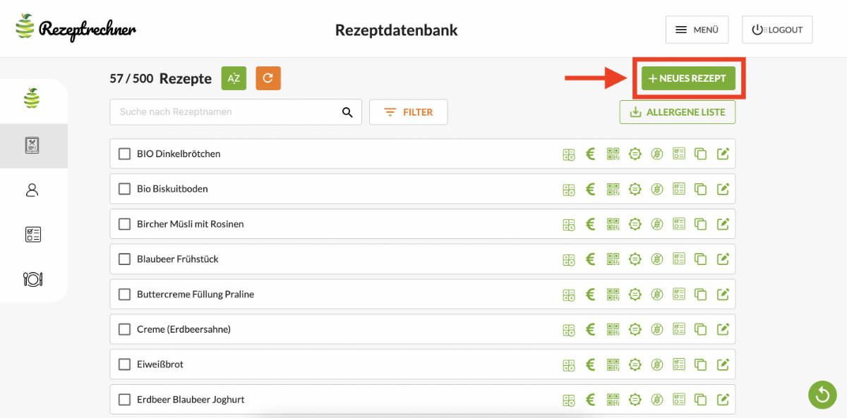 Um ein neues Rezept zu erstellen, wähle den Knopf + NEUES REZEPT.