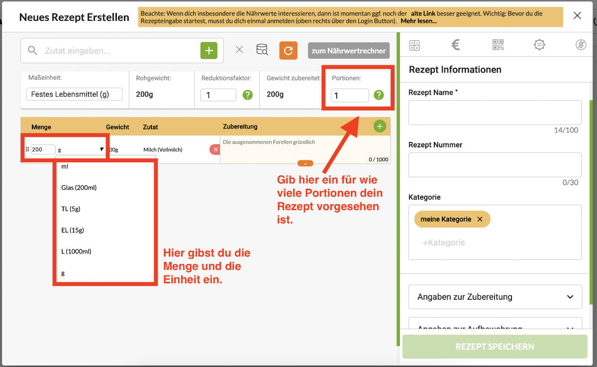 Du kannst dein Basisrezept, so wie es vorliegt, eingeben und im oberen Bereich auch angeben, für wie viele Portionen dieses Rezept vorgesehen ist.