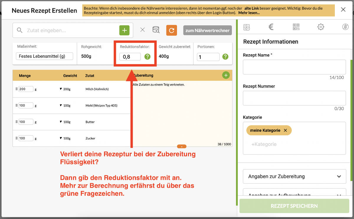 Verliert dein Rezept während der Zubereitung noch Flüssigkeit? Dann gib bitte den Reduktionsfaktor mit an. Über das Info-Feld erfährst du, wie man diesen berechnet. Der Reduktionsfaktor ist wichtig für die Nährwertberechnung denn bei einem Flüssigkeitsverlust während der Zubereitung erhöht sich die Nährstoffdichte (Nährwerte pro 100g) für dein Lebensmittel. Ein typischer Reduktionsfaktor liegt beispielsweise bei 0,8 (20% Flüssigkeitsverlust).