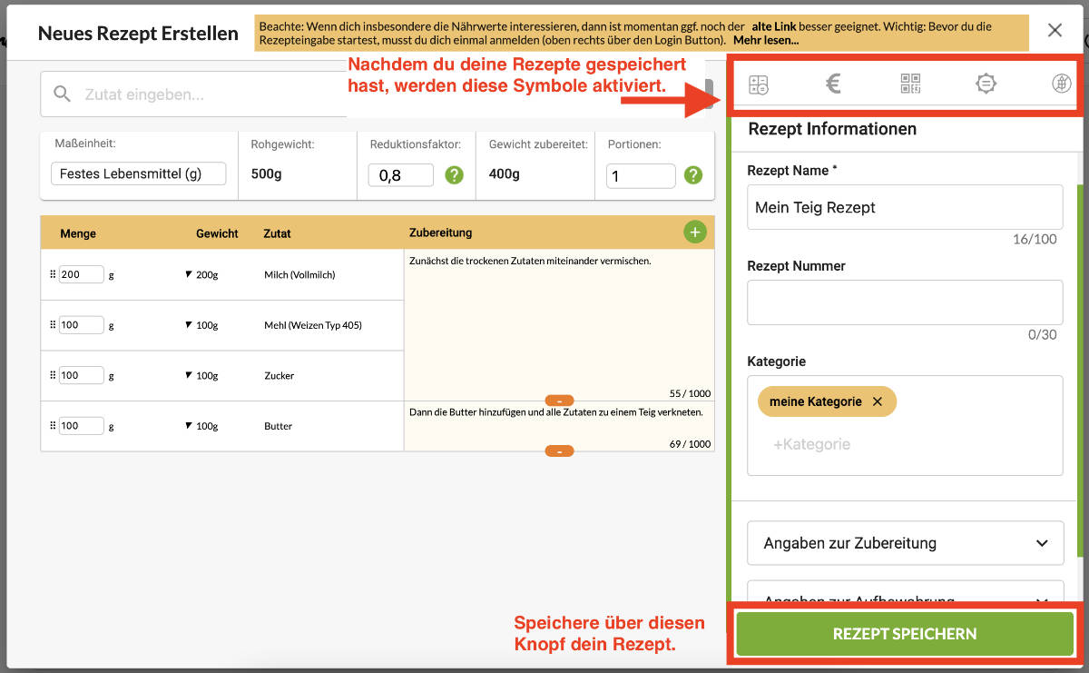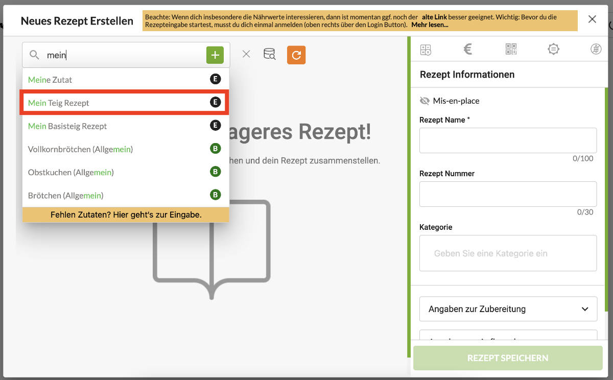 Gib dazu zunächst das Basisrezept als Rezept ein und speichere dieses Rezept.