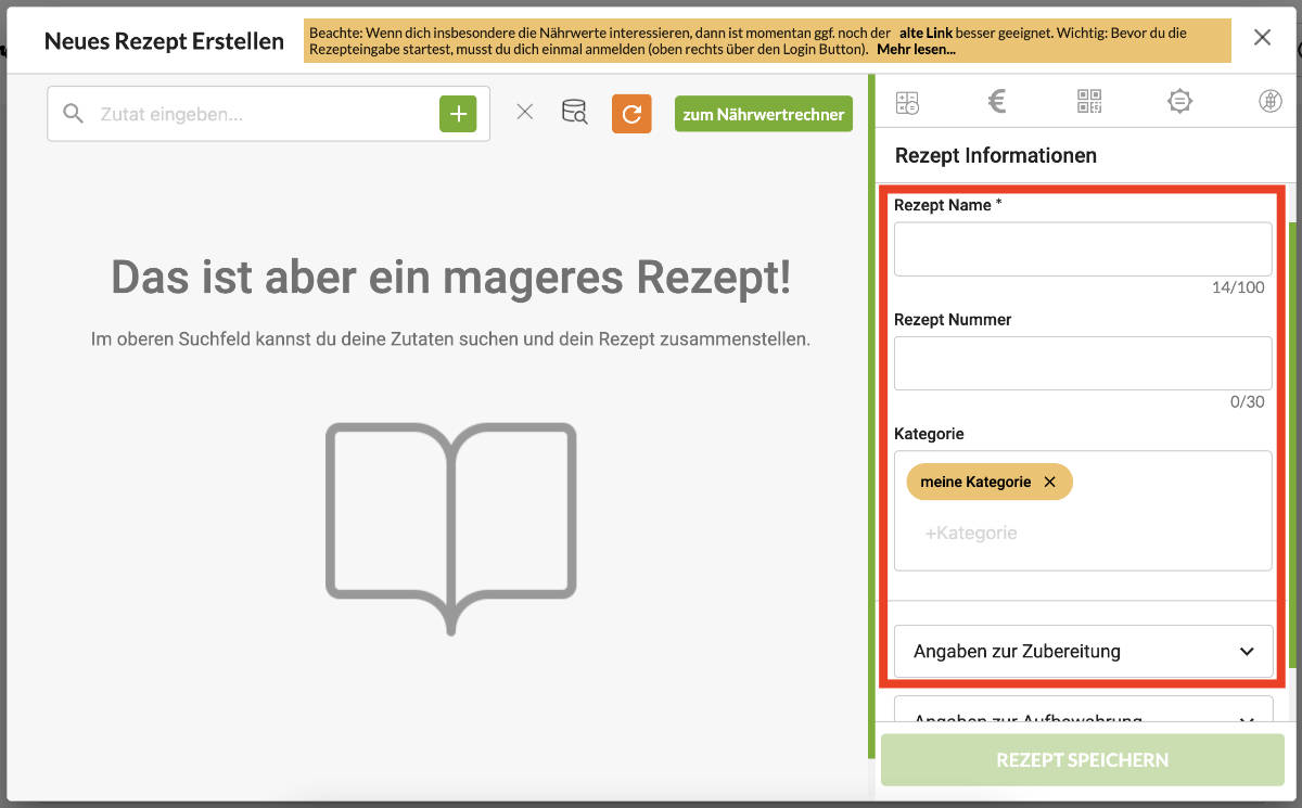 Auf der rechten Seite kannst du noch weitere Angaben für dein Rezept ergänzen. Diese übernehmen wir später beispielsweise beim Generieren vom Rezeptblatt als PDF.