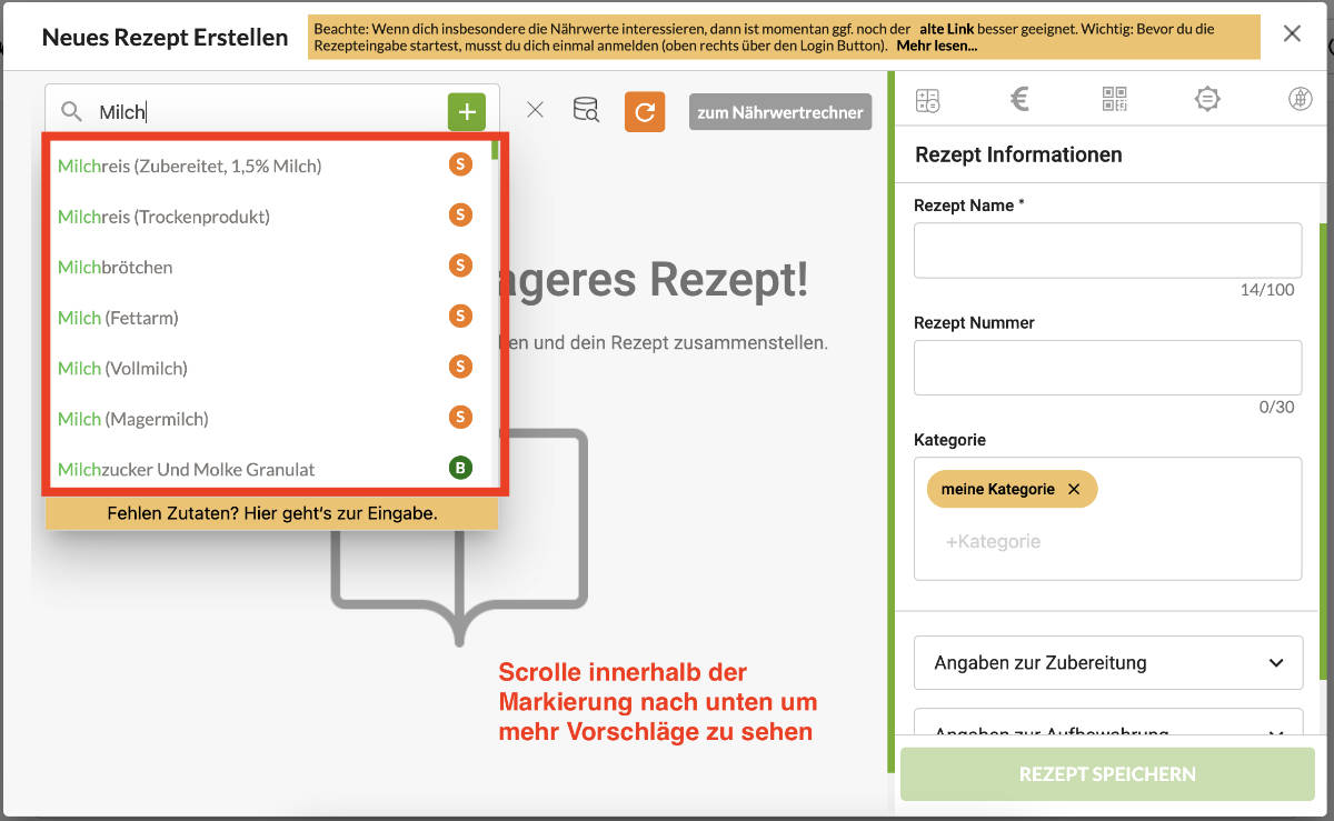 Hinweis 1: Eigene Zutaten mit eigenen Nährwerten anlegen