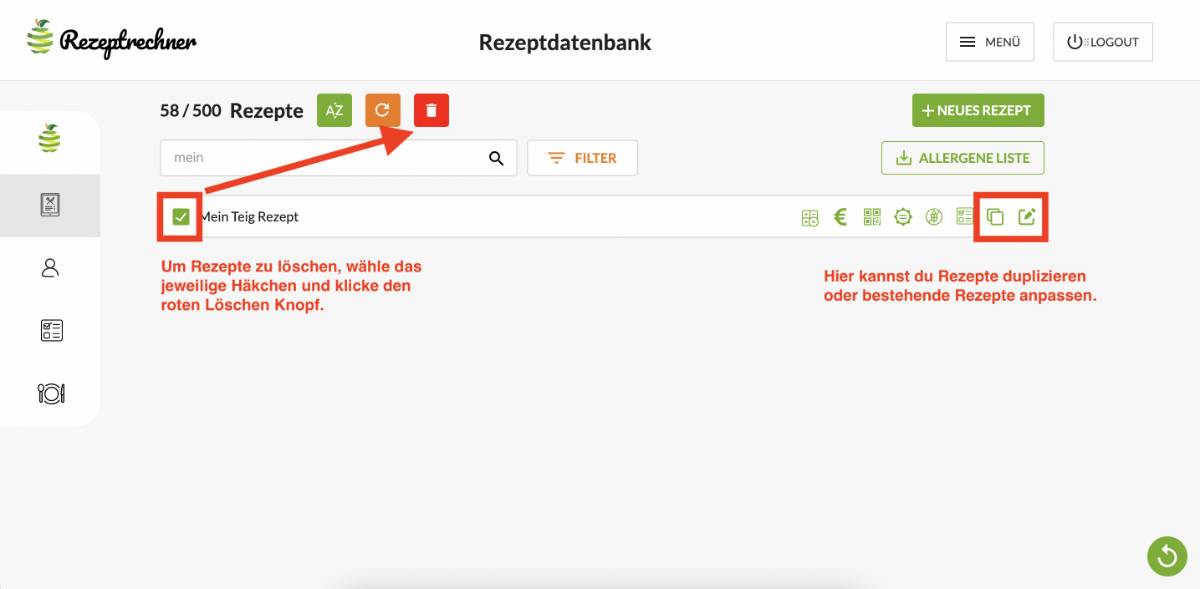 Um Rezepte zu löschen, setze das Häkchen für das jeweilige Rezept. Im Anschluss erscheint ein roter Knopf. Klicke diesen Knopf und bestätige, dass du das Rezept löschen möchtest.