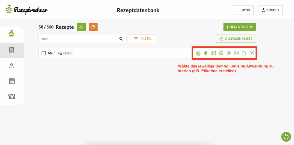 Mehr zu den einzelnen Symbole und deren Anwendungen (Etiketten Generator, Rezeptblatt als PDF erstellen etc.) erfährst du in der jeweiligen Anleitung.