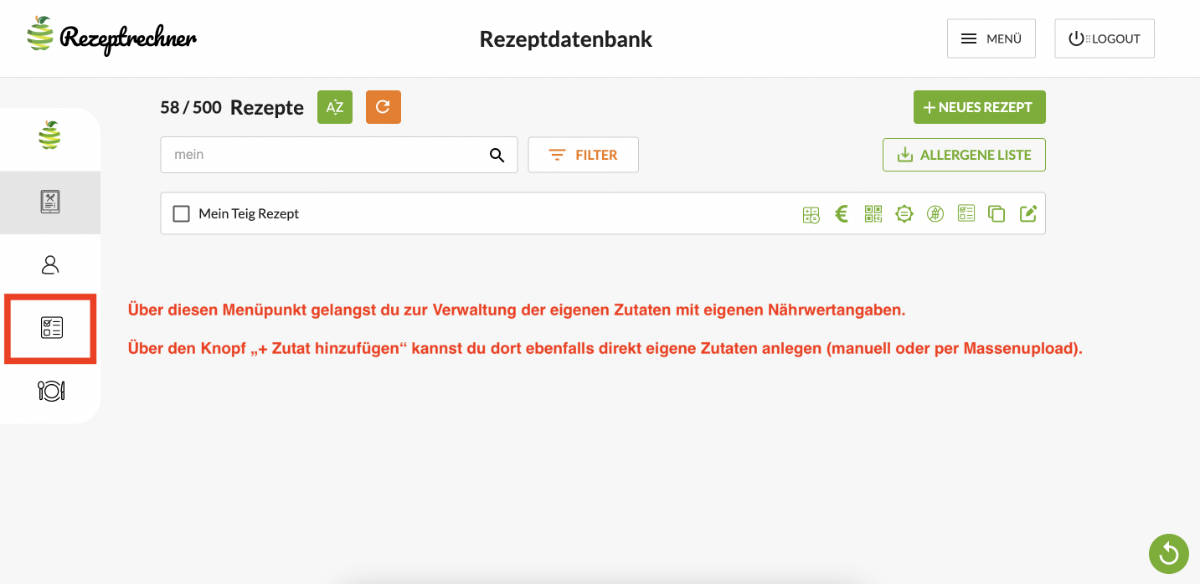 Um eigene Zutaten mit eigenen Nährwerten anzulegen, wähle entweder den Knopf „Fehlen Zutaten“ in der Rezepteingabe oder klicke auf den Menüpunkt „eigene Zutatenliste“.