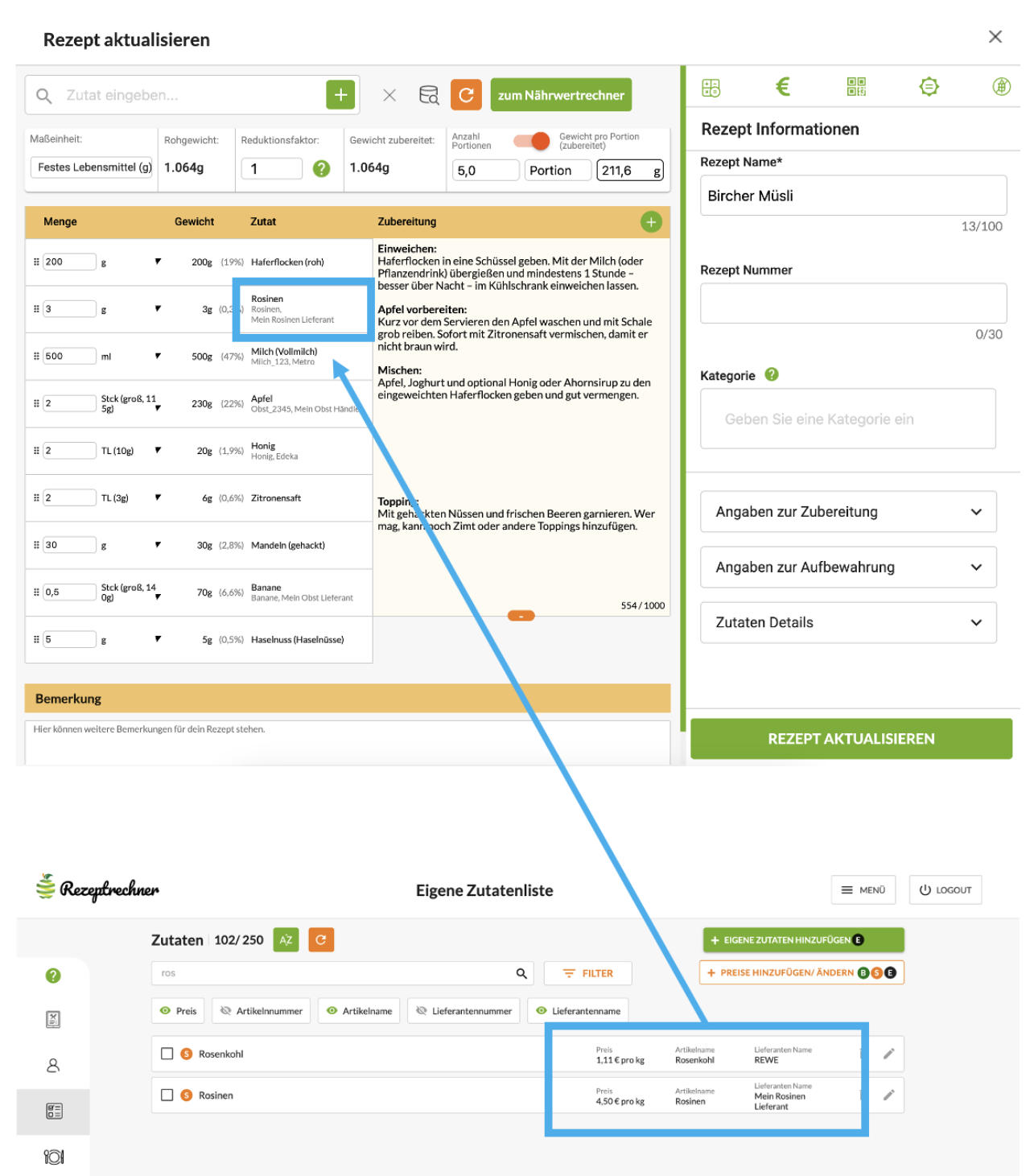 Das hat den Vorteil, dass du in der Rezepteingabe, im Rezeptblatt und der Preiskalkulation direkt weißt, welche Zutat von welchem Lieferanten konkret gemeint ist.