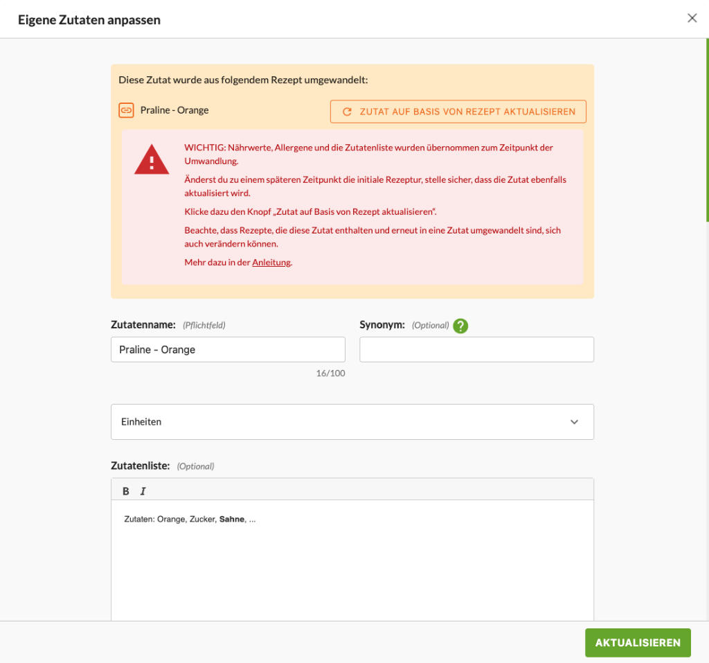 Änderst du zu einem späteren Zeitpunkt das verlinkte Rezept, dann werden die Nährwerte, Allergene und die sub-Zutatenliste nicht automatisch aktualisiert in der Zutat.